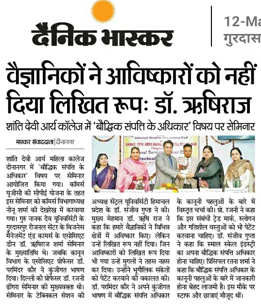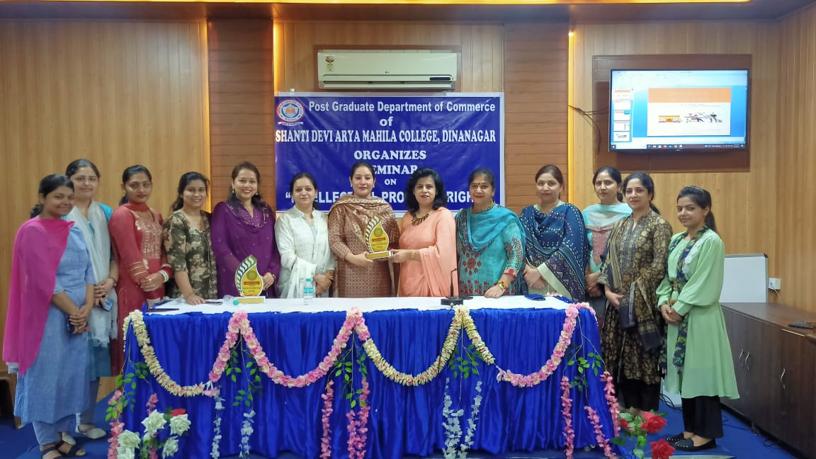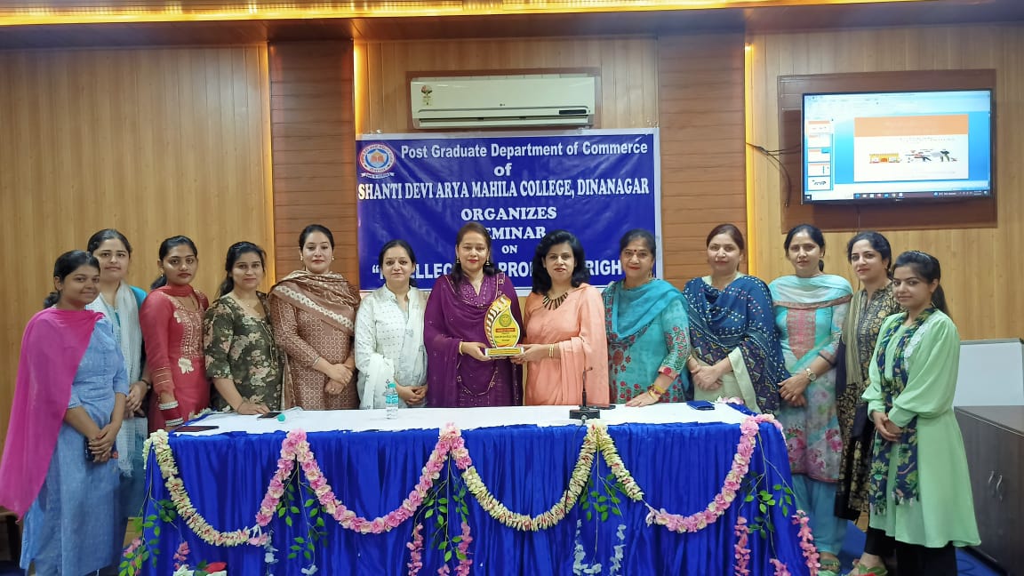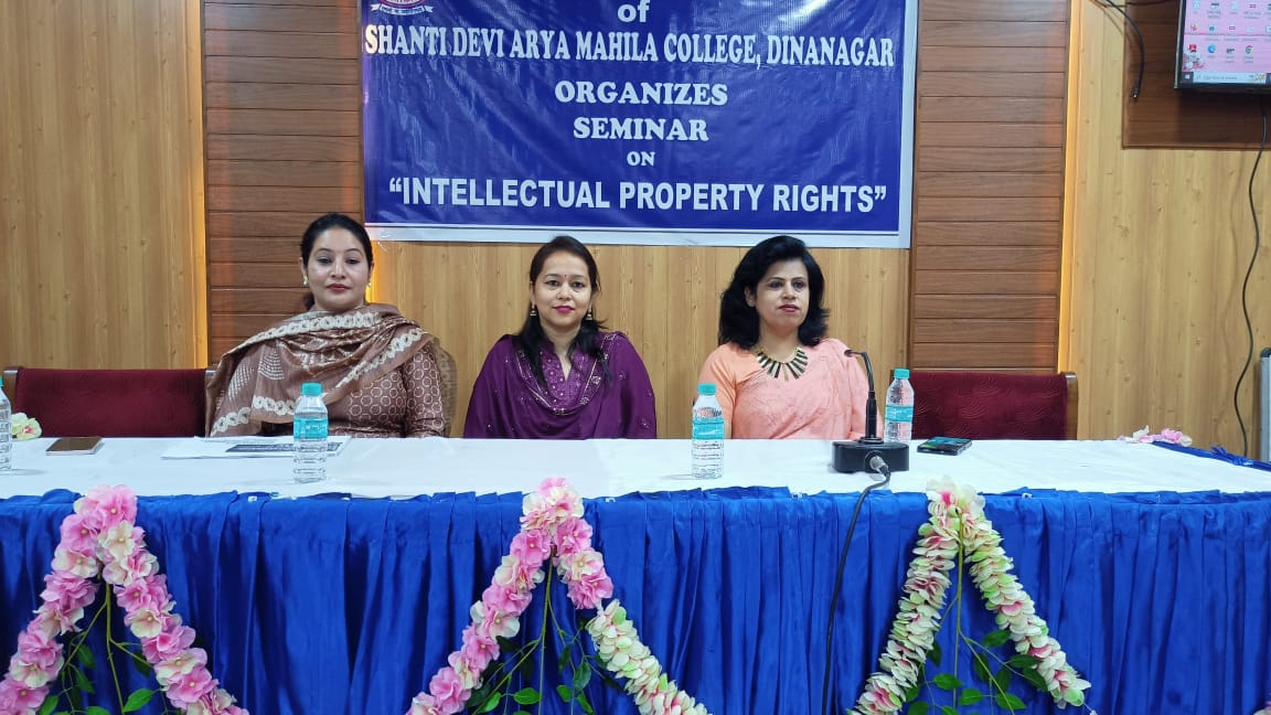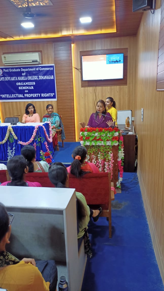 PG department of Commerce of Shanti Devi Arya Mahila College Dinanagar under the ages of IQAC and able guidance of Principal Dr. Reena Talwar organised a seminar on "Intellectual Property Rights" on 1st May 2023.The distinguished speakers were Dr. Poonam Mahajan, head of department of Commerce, Guru Nanak Dev University College, Narot jaimal Singh and Mrs. Sukhjinder kaur Assistant professor, Guru Nanak Dev University College, Sujanpur. Dr. Reena Talwar emphasised that we should be aware of our legal rights regarding our intellectual property. Mrs. Sukhjinder Kaur beautifully explained the difference between patents, copyrights, trademarks, symbols etc and the procedure to get the patent registerd in India. She also told about the fee and the time period for which we can get our patent registered. Dr. Poonam Mahajan laid emphasis on startups that an idea can make an entrepreneur and instead of being the job seeker the youth can be job provider. She motivated the students to generate ideas and become self dependent to make India great India. Dr. Neenu Sharma, head of PG department of Commerce extended vote of thanks to the distinguished speakers. The senior staff members and faculty of Commerce were present during the seminar.