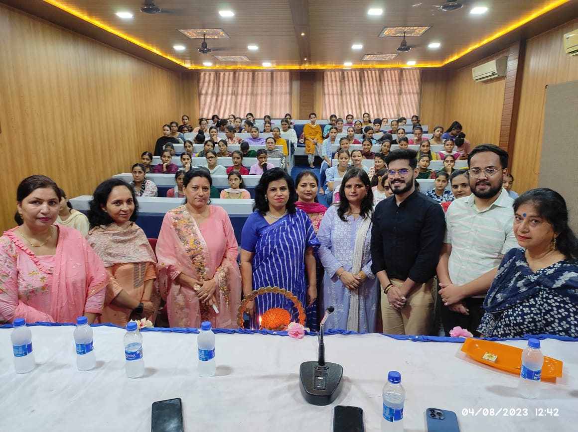 In collaboration with Entrepreneurship Development Cell of Higher Education Institutions, College organised a seminar on Entrepreneurship Development Through Skills on 4th August, 2023 at 12:00 PM.The event commenced with lighting the sacred lamp. The main speakers for the event were Mr. Samarath Sharma, Consultant, MGNCRE (Ministry of Education) and Mr. Ajay Tanwar, Consultant, MGNCRE (Ministry of Education). Principal Madam gave a floral welcome to the guests. Mr. Samarath while presenting his PPT on the topic Karigari (Skill)and Karobari (Entrepreneurship), talked about the objectives of entrepreneurship and gave a diverse viewpoint on Self Help Group. Mr. Ajay while presenting his PPT on Generating Small Business Customers with Social Media Marketing talked about the use of Social Media for small scale business. Madam Principal spoke about the Skill development in the process of Entrepreneurship, building the vocational and technical training framework as propagated by Ministry of Skill Development and Entrepreneurship. The guests visited the soothing ambiance spots Under the scheme Earn While You Learn- Art and Craft Bazaar, Cosmetology Lab, College Boutique, Exhibition Hall, Heritage Hall, College Green Areas and the disposal of Waste Management. They highly appreciated all the things. At the end of the event, the guests were bestowed with College Insignia. Principal Madam lauded the efforts of Ms. Jyoti Saini, Nodal Officer, MGNCRE, Ms. Sangeeta Malhotra, the stage conductor, the teachers of Fashion Designing department and NSS Program Officers.
