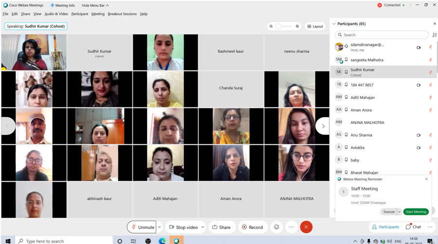 The objective of the staff meeting was to interact with the staff members who could not physically meet in college due to the COVID protocol laid down by the government . The staff congratulated Dr Reena Talwar on her selection as Principal and looked forward to working under her young and dynamic leadership . Dr. Reena thanked the staff and shared her vision about the college with the staff members and hoped for mutual co-operation for the progress of the college.