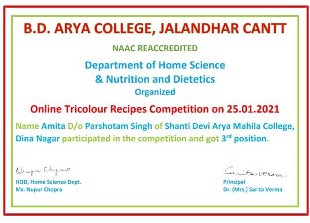 27 Jan 2021 ↑ Amita ,Home Science student from BA-V got 3rd position in Competition of Tri Colour recipe organised by B.D.Arya College Jalandhar Cant on 26/1/21.