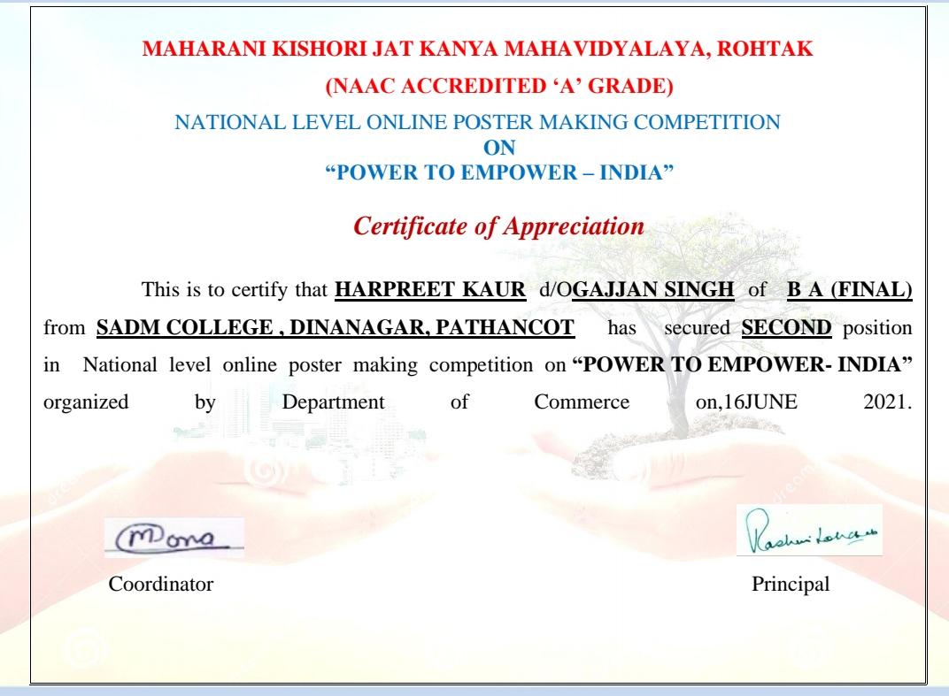19 Jul 2021 ↑ Bhawna got 2nd position In Slogan Writing competition on the topic "Shri Guru Teg Bahadur ji" at Bebe Nanki University,Kapurthala and Harpreet got 2nd position in National Level Poster Making Competition on the topic "power to empower" at Maharani Kishore Kanya Mahavidyalay, Rohtak.