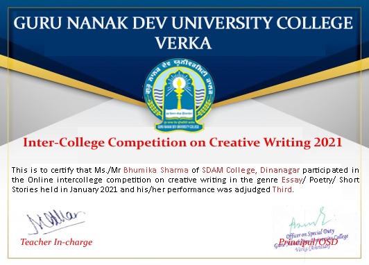 03 Apr 2021 ↑ Bhumika Sharma participated in the Online Inter college Competition on creative writing in the genre Essay/Poetry/Short stories held in January 2021 and his performance was adjudged third.