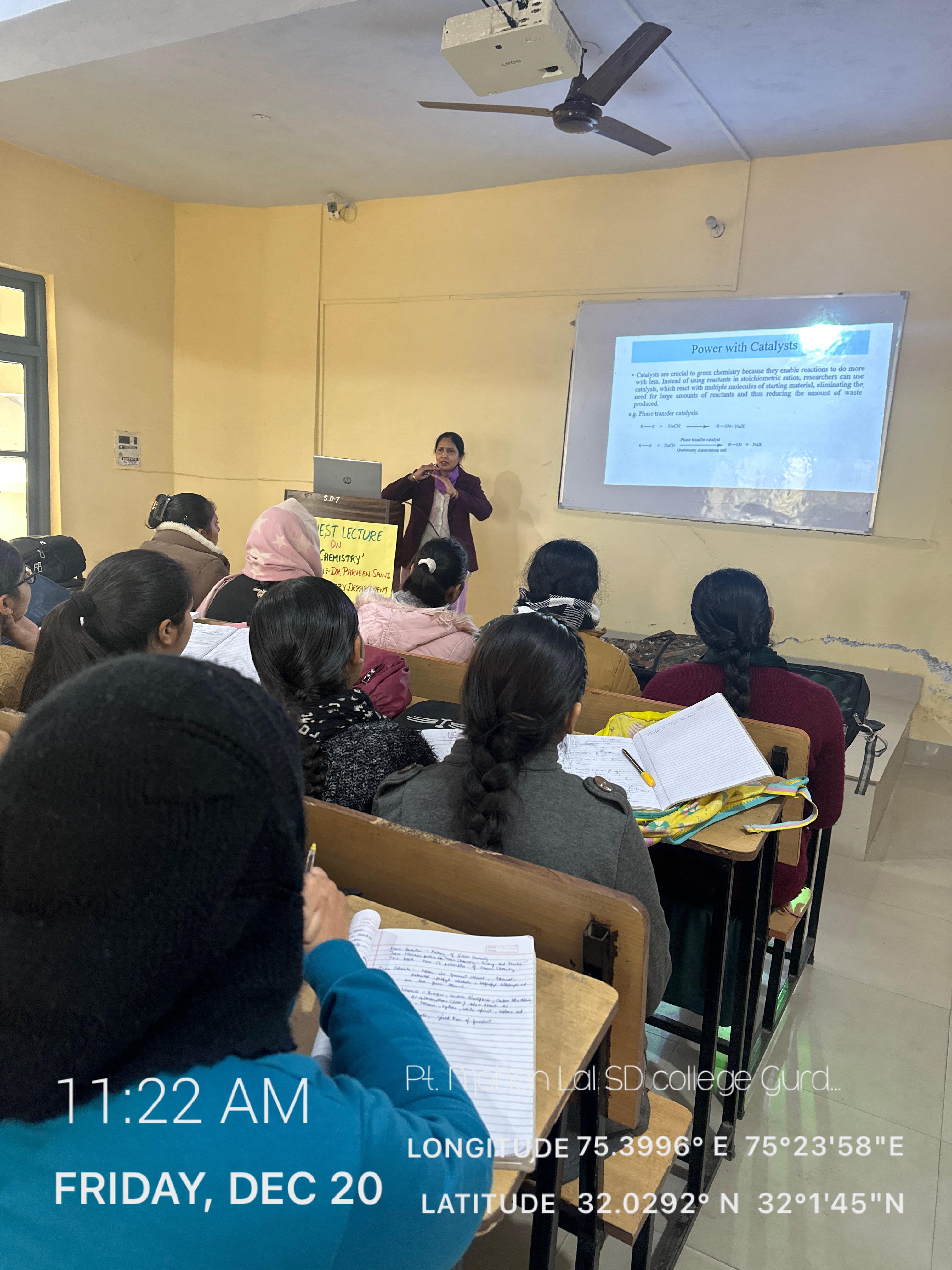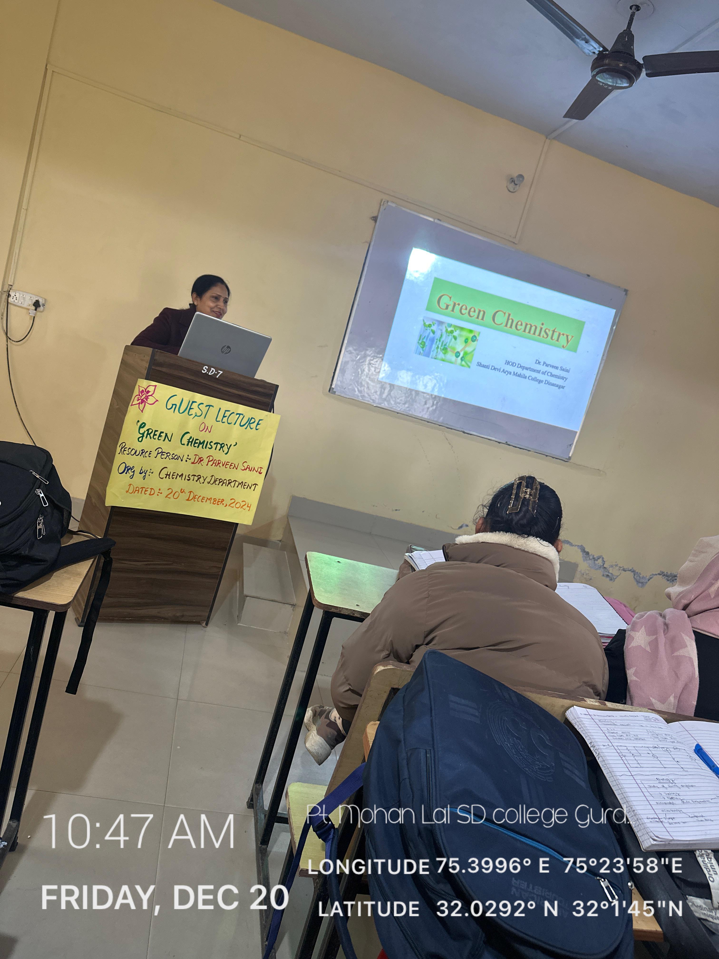 20 Dec 2024 ↑ December 20, 2024, marked an enlightening event at PT. Mohan Lal S.D. College for women, Gurdaspur, as Dr. Parveen Saini, Head of Chemistry Department delivered a lcture on the topic Green Chemistry. During the discourse, Dr. Parveen Saini discussed various aspects of Green Chemistry with suitable examples. She explained that, Green Chemistry is the design of chemical processes, products and technologies that reduces or eliminates the use and generation of hazardous substances. Green Chemistry is about reducing waste, hazards, cost, time, energy, risk etc. She focussed on all the twelve principles on which green chemistry works and told that this approach works on pollution prevention on molecular scale. The lecture ended with satisfactory answers to students queries. The event was a huge success with the full participation of students.