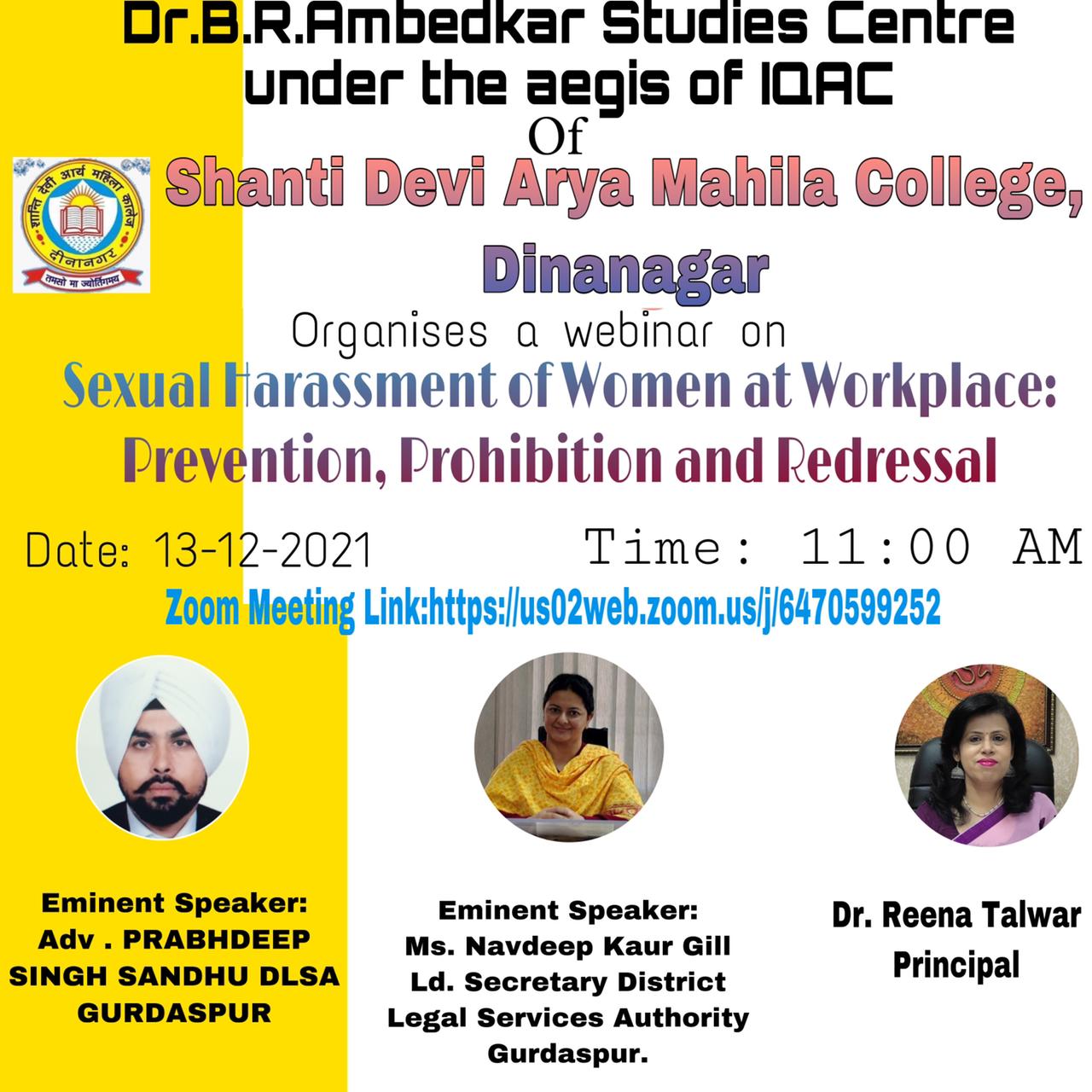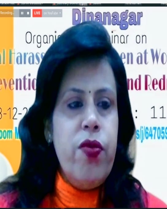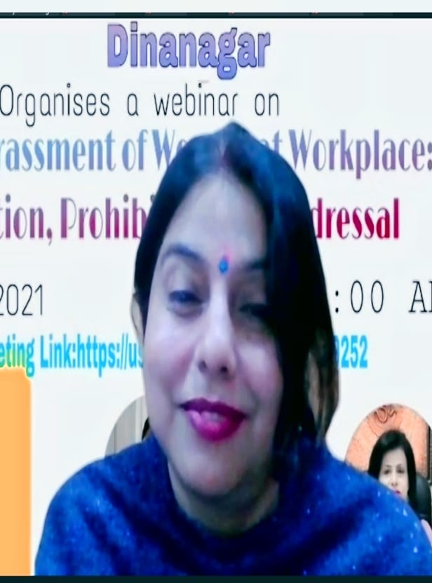 Shrimati Navdeep Kaur elaborated legal provisions especially 2013 Act for the protection of women at workplace. Sexual harassment includes such unwelcome sexually determined behavior as physical contact and advances, demand or request for sexual favors, sexually colored remarks, showing pornography and any other unwelcome physical verbal or non-verbal conduct of sexual nature. Advocate Prabhdeep Singh stated that sexual harassment violates the women’s fundamental right of gender equality and life with dignity under article 14 and article 21 respectively. Although there are no specific laws for curbing sexual harassment at the workplace in India but certain provisions are there in other legislation like Indian Penal Code, which provides protection against women’s sexual harassments. He elaborated all provisions in constitution and Indian penal code regarding this issue. Principal Dr. Reena Talwar stated that Indian society is highly cultured society and sexual harassment is a curse for our rich heritage. She also discussed Me Too campaign that highlighted the problem of sexual harassment. Dr. Anjna Malhotra, coordinator of webinar, stated that with education and right to equality in constitution provide women various dimensions to work and to earn livelihood but due to unsafe environment women are facing many physical, social and psychological stress. Many provisions are there in constitution to protect women but due to lack of awareness and hesitation women are still suffering from this problem. Shanti Devi Arya Mahila College Dinanagar always tries to inculcate good values and confidence among women so that they can face the society and move ahead with courage and wisdom. Dr. Anjana Malhotra also thanked Mrs. Deepak Jyoti, Mrs. Priyanka Gupta and all the staff members.