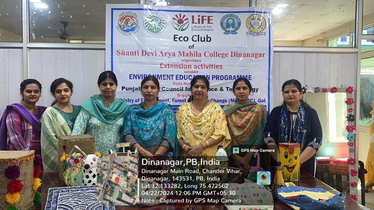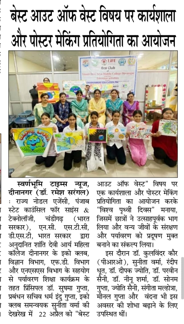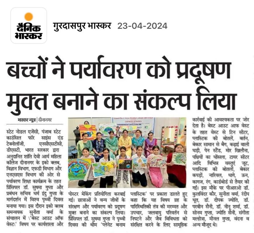 On this day Workshop on best out of waste and poster making competition was organised, in which the students participated enthusiastically. Principal madam threw light upon theme for Earth Day 2024, “Planet vs. Plastics. She told that this theme emphasizes the need for collective action to repair and heal the planet's ecosystems, combat climate change, and preserve biodiversity. For the best out of waste activity, Various articles made were Tin Seater, plastic bottles Pots, waste material Bags, Embroided clock, Pen stand , peacock toy, birds nest, tyres seater etc. from Waste Materials like: jute, plastic bottles, waste fabric, coconut, threads, wool, papers , colour, cardboard etc.During this day Dr. Kulwinder Kaur (PRO), Mrs. Sunita Verma, Mrs. Randeep Dhoot, Dr. Deepak Jyoti, Dr. Parveen Saini, Dr. Neenu Sharma, Dr. Sonam Gupta, Dr. Anjna Malhotra, Mrs. Jyoti Saini, Mrs. Sangeeta Malhotra, Mrs. Meenal Gupta, Mrs. Vandana and Ms. Rajwant were also present to enhance the grace of the occasion