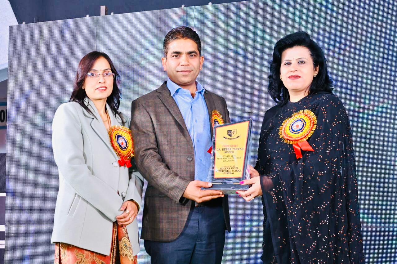 25 Dec 2022 ↑ It is a matter of exceptional ecstasy that our Principal, *Dr. Reena Talwar* of the esteemed Institution Shanti Devi Arya Mahila College, Dinanagar was invited to be the *Chief Guest* on the *Annual Day* ceremony of *Modern Angel Public High School, Garmal* on 24th December, 2022. She was all in praise of the performances held by the students of the school. She expressed her gratitude to the Principal, Mr. Bhupesh, Mrs. Neha Mahajan, the School Faculty, the Management for inviting her. Her presence made a significant contribution in the successful accomplishment of the program.