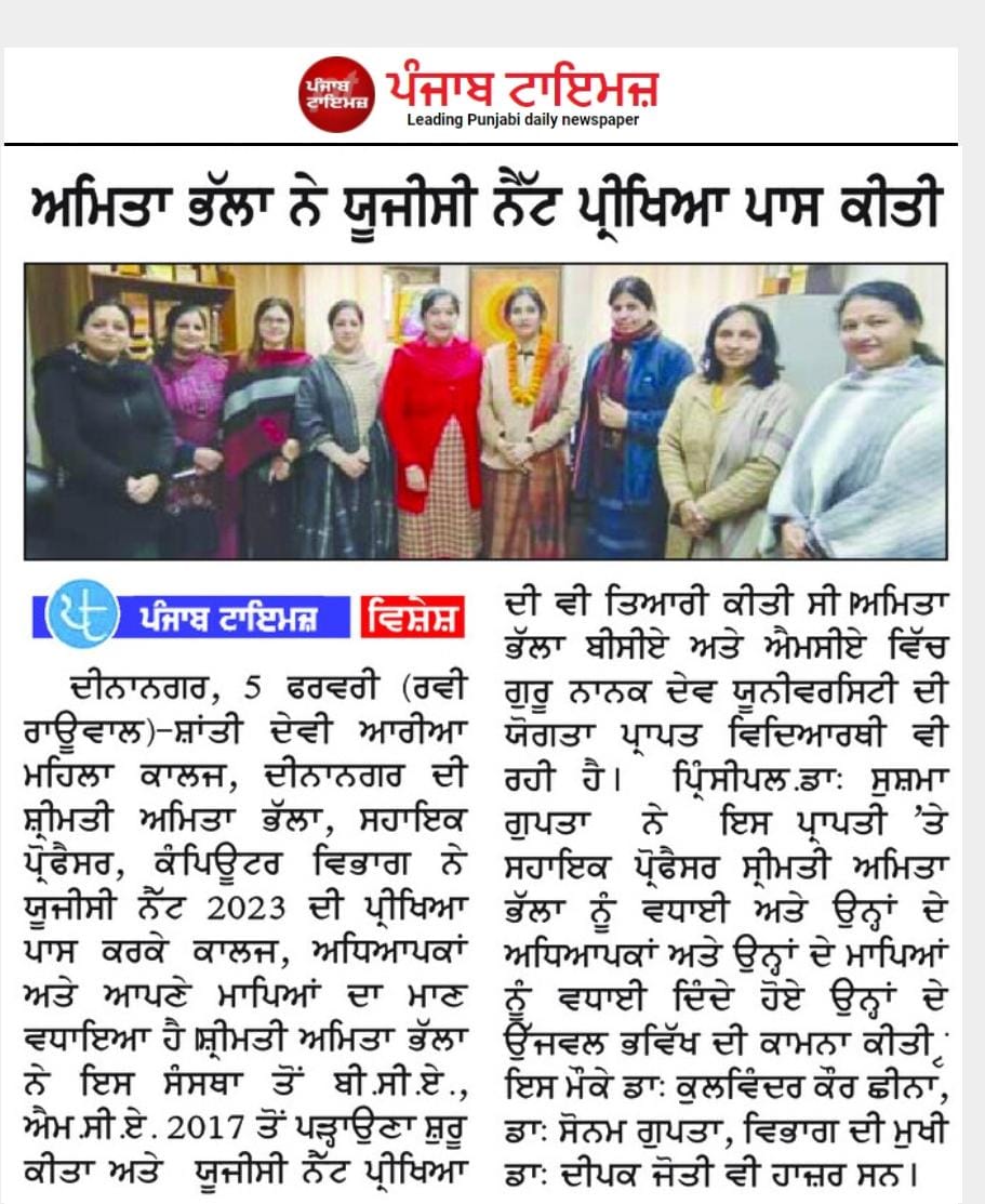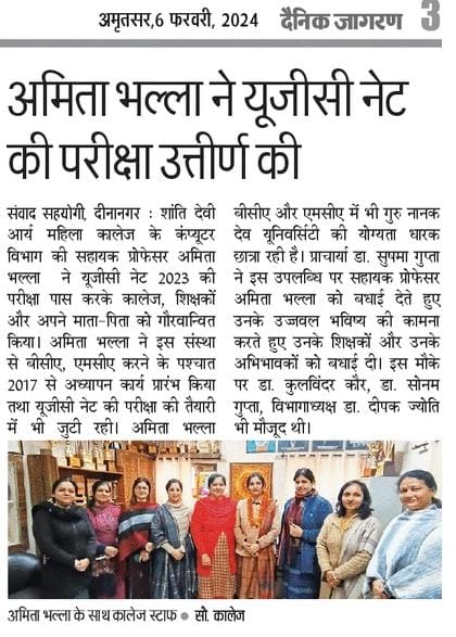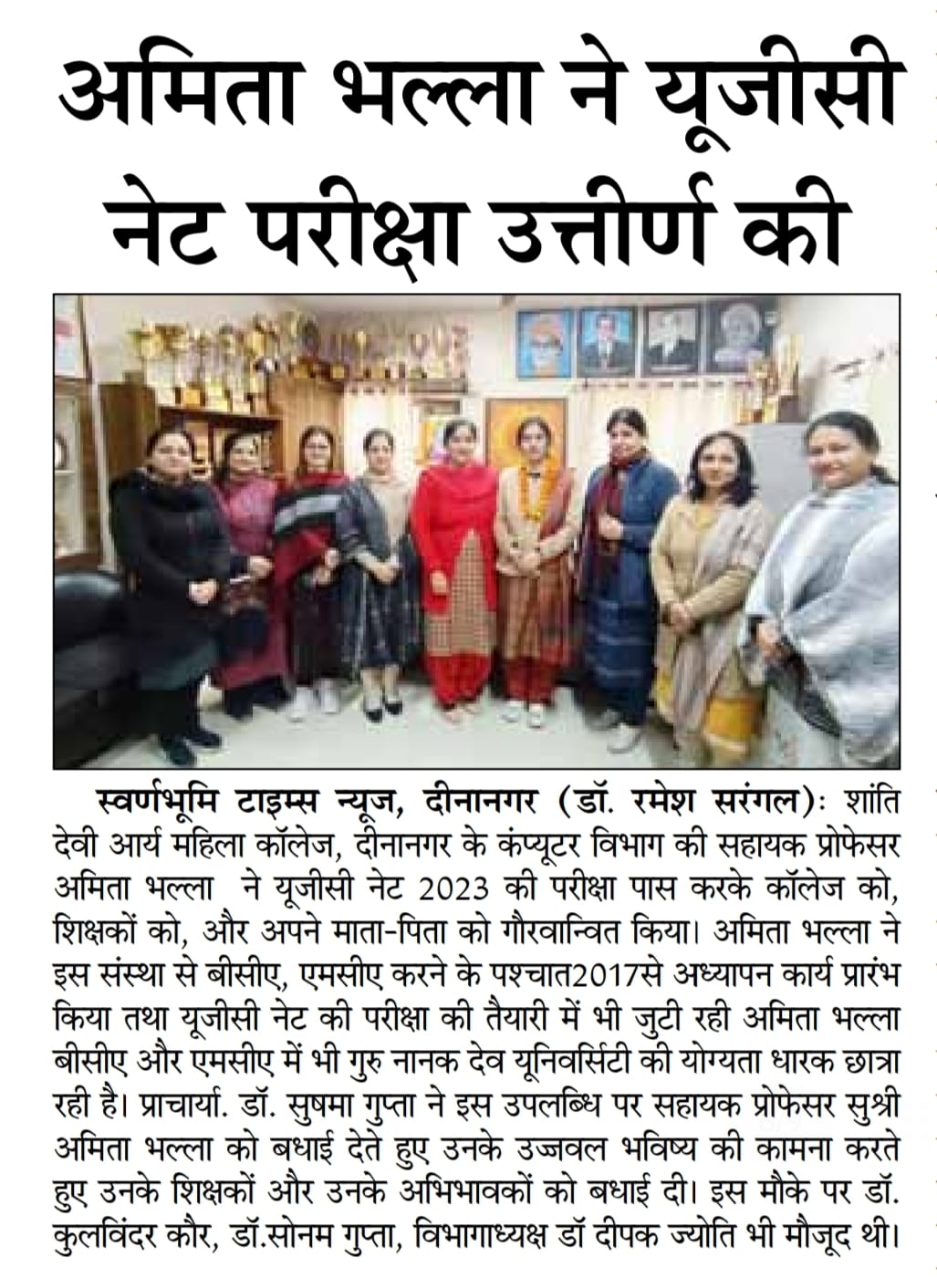 She has been an industrious teacher showcasing her prowess in extra-curricular activities. She gives the credit of her success to her father Mr. Janak Raj, her mother Ms. Raj Kumari and her husband Mr. Vikas Bhalla. Principal Dr. Sushma Gupta congratulated Department Head, Dr. Deepak Jyoti and Ms. Amita Bhalla on this achievement and wished her a bright future.