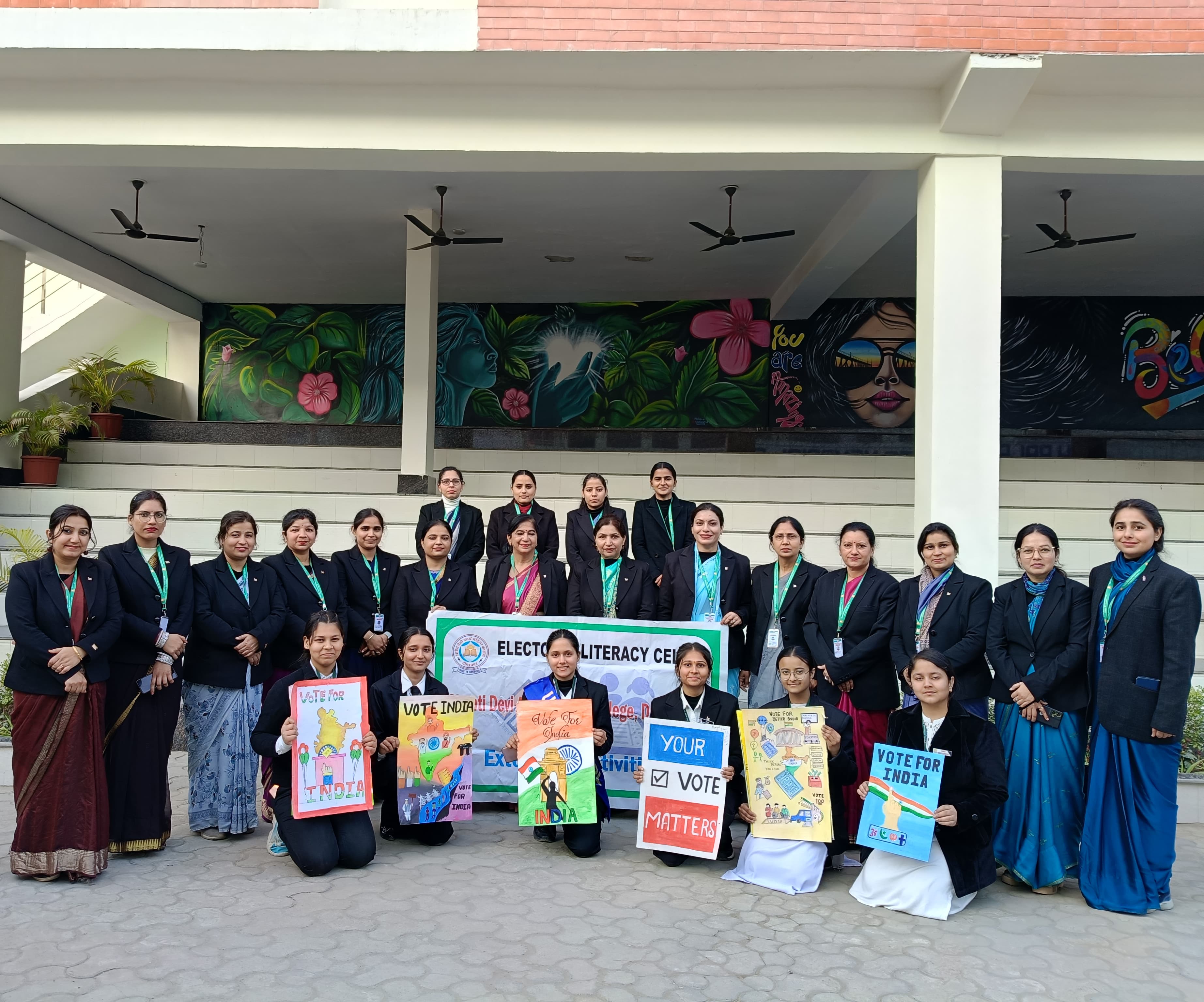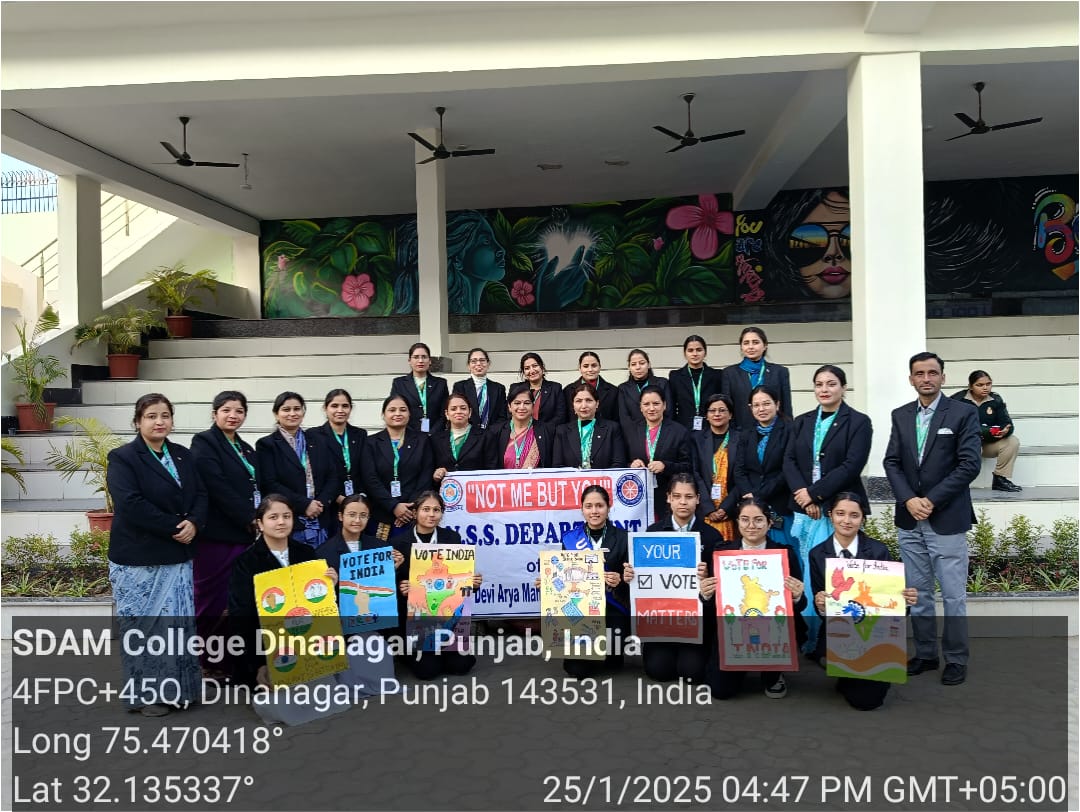 25 Jan 2025 ↑ National Voter's Day was celebrated on January 25, 2025, under the guidance of Principal Dr. Sarla Nirankari and the managing committee. The event was a collaborative effort between the NSS department, Ek Bharat Shresht Bharat Club, and Electoral Literacy Cell. Dr. Sarla Nirankari motivated the students, emphasizing the significance of National Voter's Day in promoting awareness about the importance of voting and encouraging active participation in the electoral process, particularly among the youth. To spread awareness about the importance of National Voter's Day and the values of voting, a poster-making competition was organized. The event aimed to inspire students to exercise their right to vote and become responsible citizens. The celebration was a resounding success, with enthusiastic participation from students and faculty members.