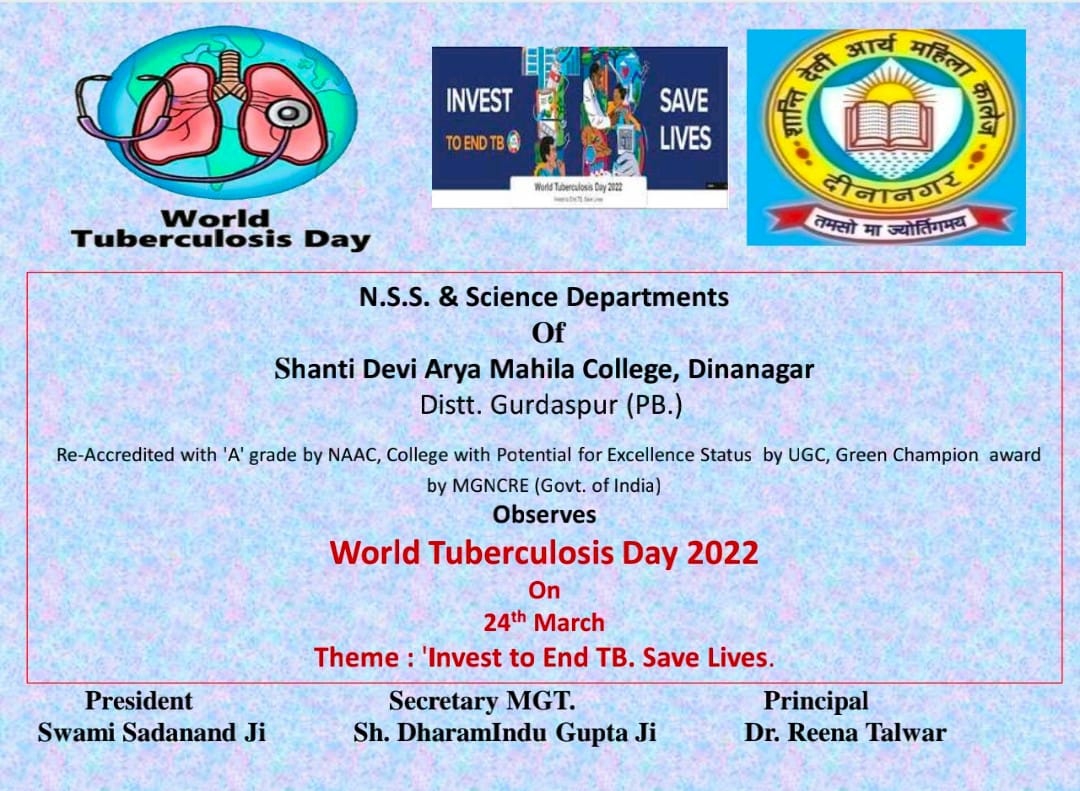 N.S.S. & Science Departments of Shanti Devi Arya Mahila College, Dinanagar observed “ World TB Day on 24th March. Theme of World TB Day 2022 is 'Invest to End TB. Save Lives.
