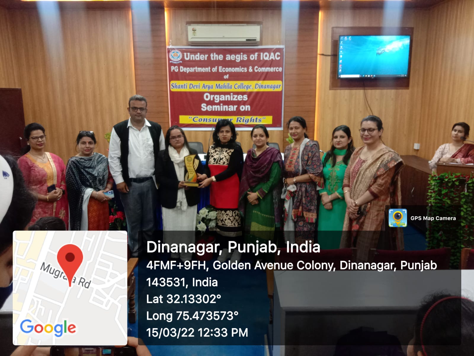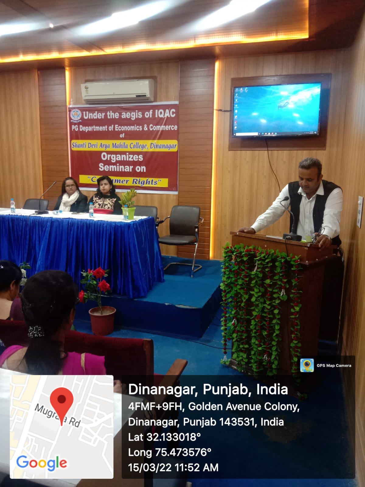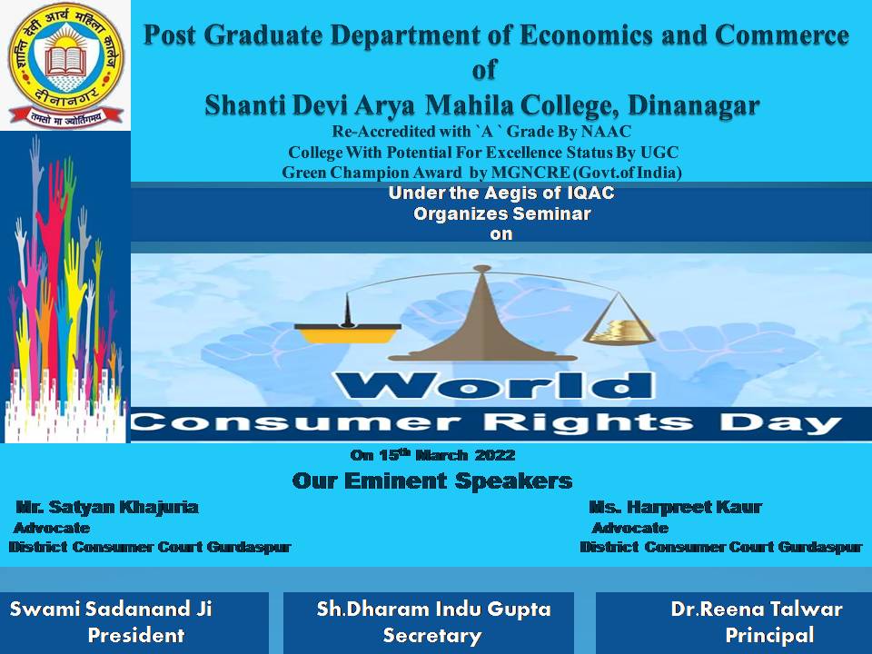 Post Graduate department of Economics and Commerce of Shanti Devi Arya mahila College Dinanagar, under the able guidance of Principal Dr. Reena Talwar ( under the ageis of IQAC) organised a seminar on "Consumer Rights" to celebrate 'World Consumer Rights Day'. Advocate Mr Satyan Khajuria and Advocate Ms. Harpreet Kaur were the eminent speakers. Mr Satyan Khajuria told about consumer rights and redressal machineries. Ms. Harpreet Kaur told about using or implementing our rights which can be achieved only by having the appropriate knowledge about the rights. Principal Dr. Reena Talwar also shared views on the topic and honoured the eminent speakers. Ms Rama Kapoor conducted the stage and praised the government campaign 'Jago grahak Jago'. Mrs Neenu Sharma, Mrs Shelika, Mrs Ekta and all other staff members were also present.