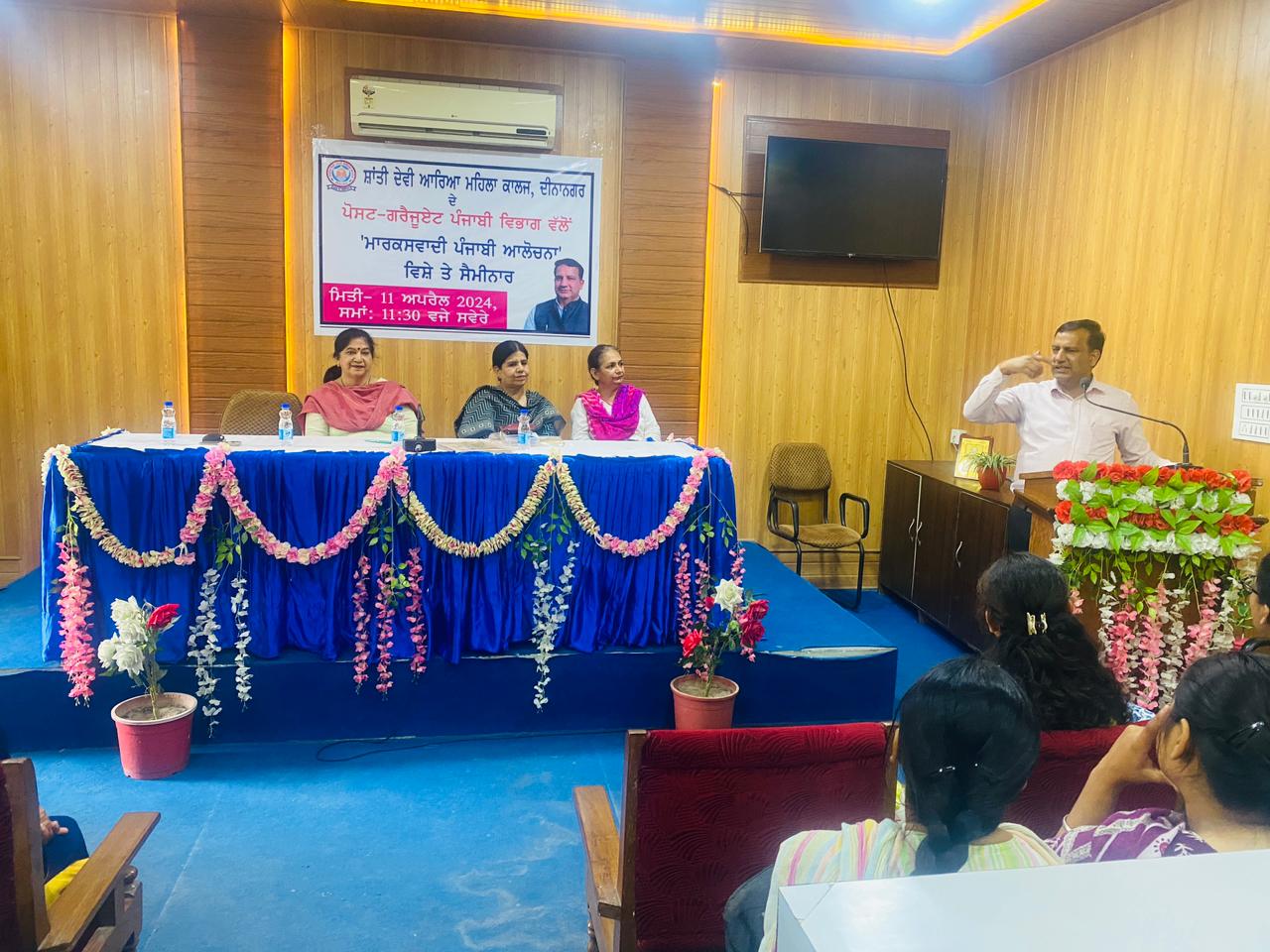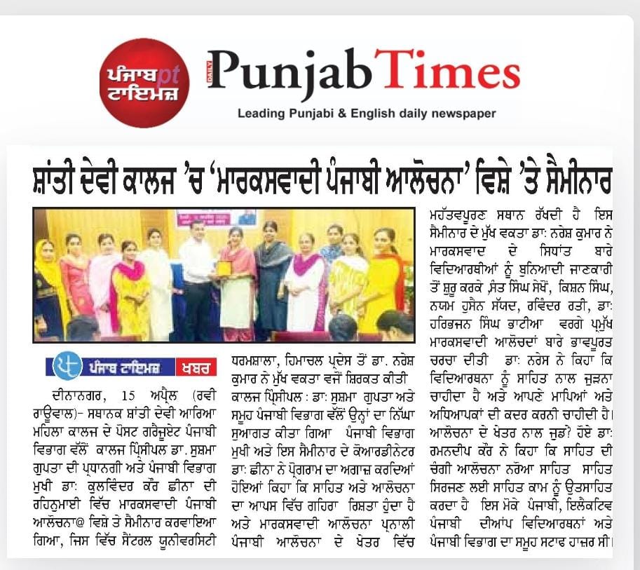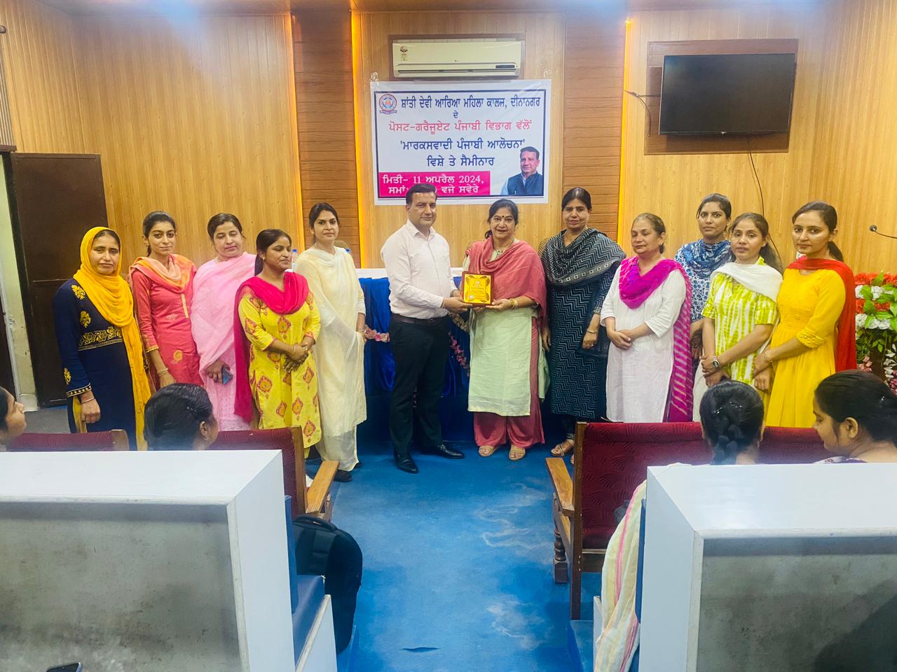 Dr. Sushma Gupta along with the faculty of Punjabi Department welcomed him with potted plant. In her welcome address, Dr. Kulwinder Kaur, the coordinator of the seminar, commenced the program emphasising the profound relation of Literature and Criticism. She added that Marxist criticism is one of the important trends of Punjabi criticism. According to the viewpoint of Principal Dr. Sushma Gupta, a Literary criticism enables the readers to understand the relationship between author and work and to analyse the thematic aspects within the texts. Narrating the principles of the said topic, Dr. Naresh gave an elaborated overview of the famous critics like Mr. Sant Singh Sekhon, Mr. Kishan Singh, Mr. Najam Hussain Syed, Mr. Ravinder Ravi, Dr. Harbhajan Singh Bhatia. Dr. Ramandeep Kaur said that a good work of criticism paves a way for the portrayal of literary works. All the students jotted down the crucial points and thoroughly enjoyed the seminar. At the end of the seminar, Principal Dr. Sushma Gupta, Dr. Kulwinder Kaur along with the faculty of Punjabi Department presented him the souvenir.