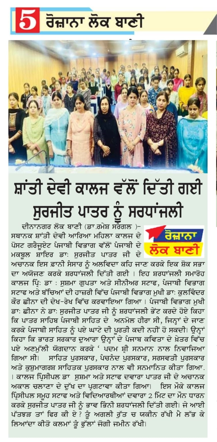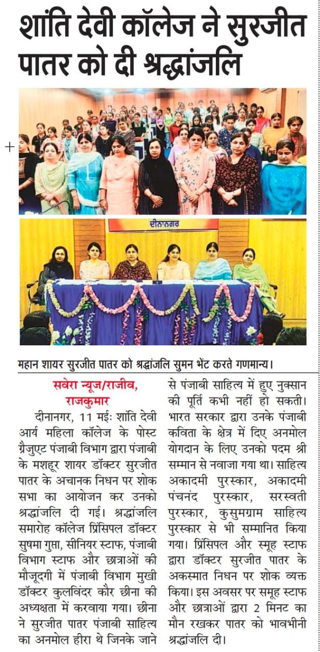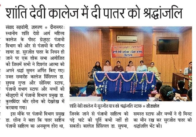 Emphasising on his brilliant writing, Principal Dr. Sushma Gupta said that his poetry touched the chords of the heart and its musical quality reverberated in the recesses of the mind. He was also awarded with Sahitya Akademi Award, Panchnad Award, Saraswati Award and Kusumagraj Literary Award. The college principal Dr. Sushma and the staff expressed grief over the sudden demise of Dr. Patar. On this occasion, the college principal, staff and students observed two minutes of silence and paid tribute to Surjit Patarji.
