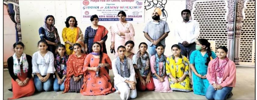 09 Aug 2021 ↑ Punjab Folk Art Centre Gurdaspur is organising Two week Free workshop of Giddha and Sammi, (Folk Dances) of Punjab, in collaboration with Shanti Devi Arya Mahila college Dinanagar Punjab , under Scheme of Performing Arts Ministry of Culture Govt of India. College Principal Dr. Reena Talwar inaugurated the workshop and motivated the fresher students to learn our state culture.