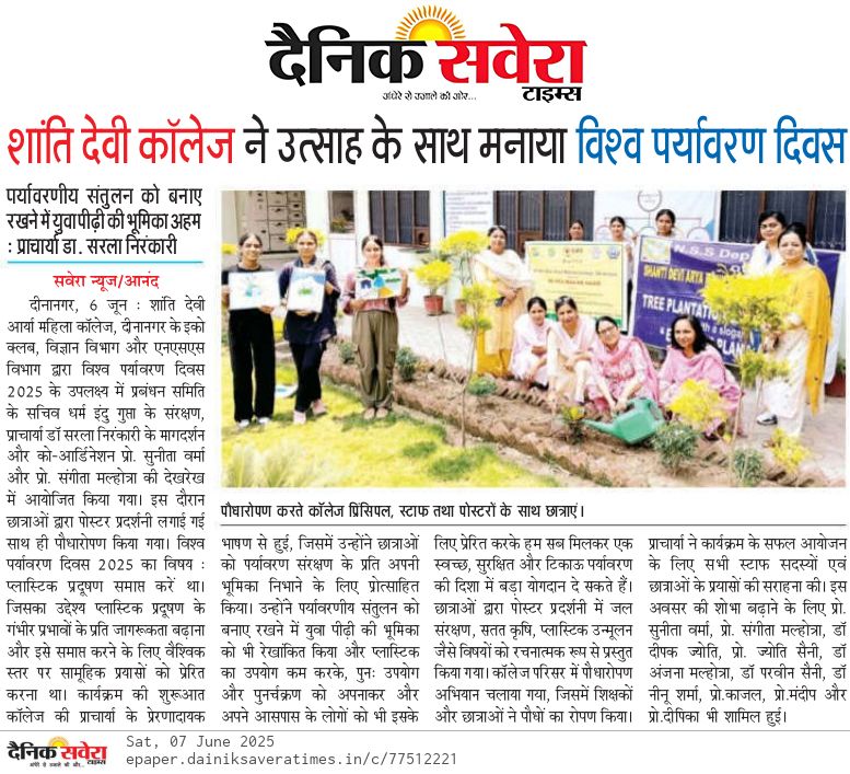 The program began with an inspiring speech by the Principal Dr. Sarla Nirankari, who encouraged the students to play their role in environmental conservation. She emphasized the vital role of the younger generation in maintaining ecological balance. On this occasion, the students creatively presented topics such as water conservation, sustainable agriculture, and plastic eradication through a poster exhibition. Alongside this, a tree plantation campaign was carried out in the college campus, during which teachers and students together planted various saplings. The theme of World Environment Day 2025 was “Beat Plastic Pollution”, aiming to raise awareness about the grave effects of plastic pollution and to inspire collective global efforts to eliminate it. Principal Dr. Sarla Nirankari stated that by reducing the use of plastic, adopting reuse and recycling practices, and motivating people around us to do the same, we can all make a significant contribution towards a cleaner, safer, and more sustainable environment.Thus, the event not only served to raise awareness but also successfully inspired students to take active steps in environmental protection. The celebration of World Environment Day conveyed the message that protecting the Earth is a collective responsibility, and its future depends on the efforts we make today.The Principal Madam appreciated the efforts of all staff members and students for the successful organization of the events. On this occasion, to grace the event, Mrs. Sunita Verma, Mrs. Sangeeta Malhotra, Dr. Deepak Jyoti, Mrs. Jyoti Saini, Dr. Anjna Malhotra, Dr. Parveen Saini, Dr. Neenu Sharma, Ms. Kajal, Ms. Mandeep, and Ms. Deepika were also present.