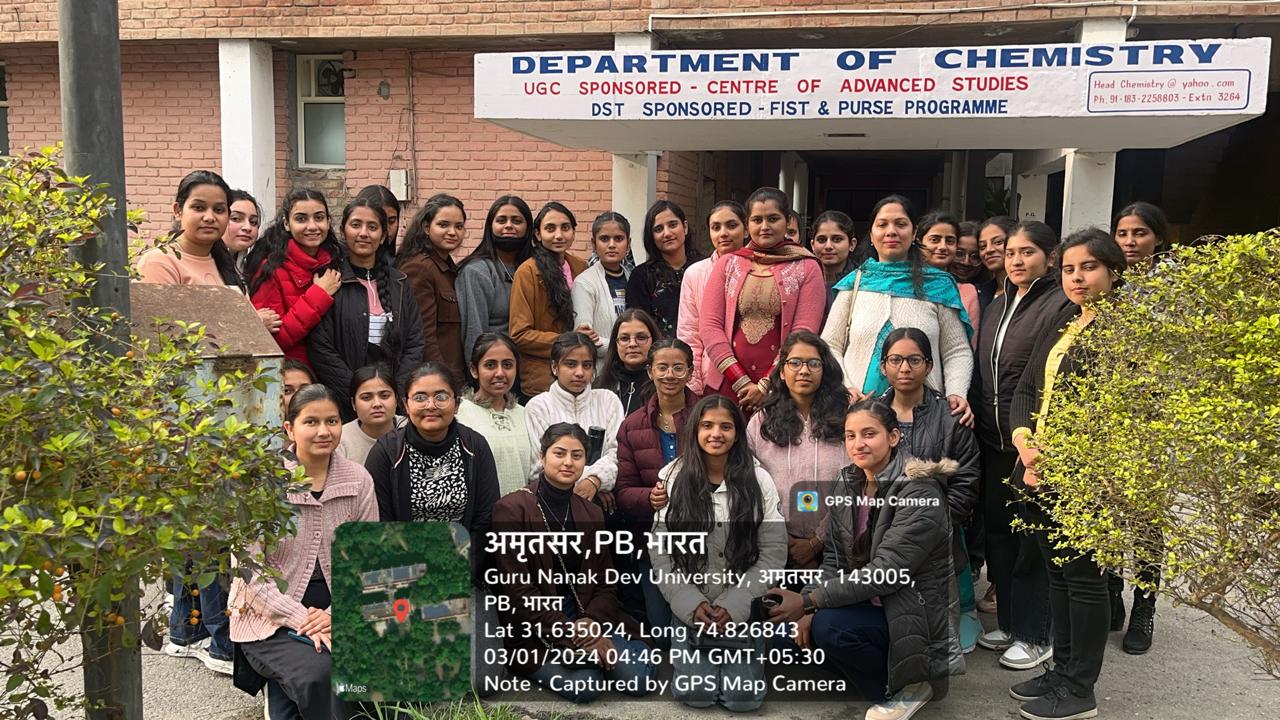 After that they visited the PG Department of Chemistry, Khalsa College Amritsar and learned the functioning of different instruments like FTIR and UV-spectrometer. They also attended the lecture of prof.(Dr.)Pushpendu K. Das on the topic- Second Order Non-Linear Optics. After that theĀ students went to Department of Chemistry, GNDU Amritsar with the permission of Dr. Palwinder Singh, Head Department of Chemistry, Where the students learnt about the operation of high tech. Instruments like TGA, NMR, XRD, Refrectometer, DC, HPLC under the supervision of Dr. Ashwani Sood.The trip inculcated scientific tempor and experiential knowledge among students. The whole event become successful with the able supervision, efforts and guidance of Assistant professors Ms. kanika and Ms.Suchetna (Department of Chemistry) and Ms. Pallvi (Department of Physics).Madam Principal Dr. Sushma Gupta motivated the students and said that these Tc tc knowledge and practical applications of science. Field trips promote critical thinking, nurture the sense of curiosity and make learning more memorable, engaging and relevant. She appreciated the efforts of Science Department.