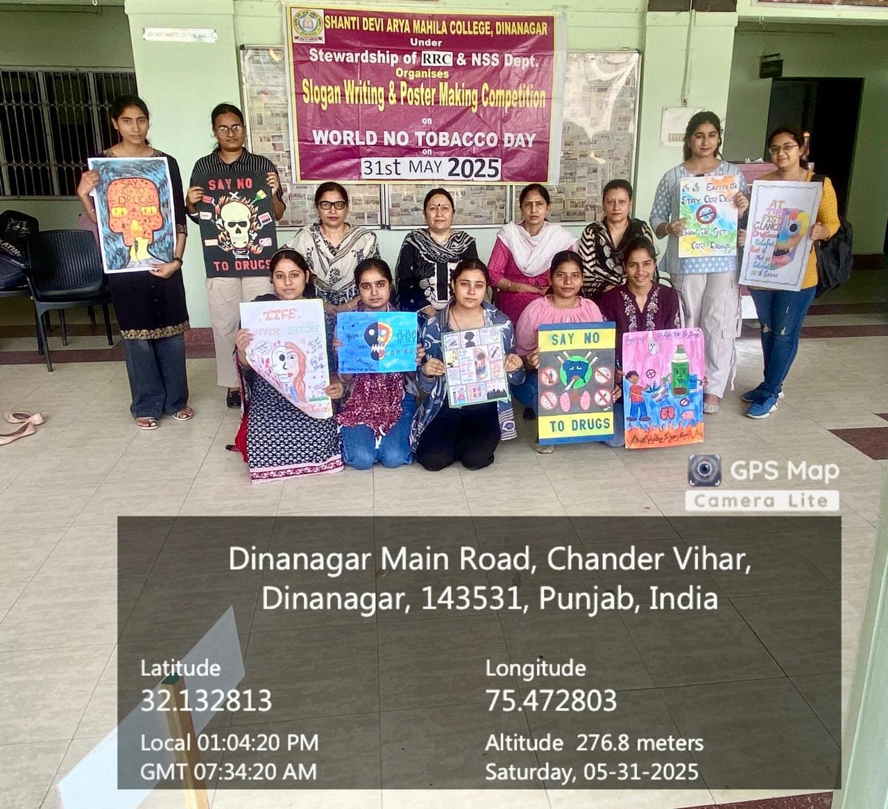 31 May 2025 ↑ Under the aegis of IQAC and able direction of Principal Dr. Sarla NirankariRed Ribbon Club and NSS Department organised Poster Making and slogan writing competition to create awareness on World No Tobacco Day on 31st May 2025 . Posters made by students were displayed on wall of college to create awareness. Principal madam told the students that this day aims to spotlight the dangers of tobacco and advocate for prevention and quitting. She asked the students to convey the harmful effects of tobacco on health among their family members and society . The program was organised under the supervision of NSS Program Coordinator Mrs. Sangeeta Malhotra and nodal officer of EBSB club Mrs. Sunita Verma .