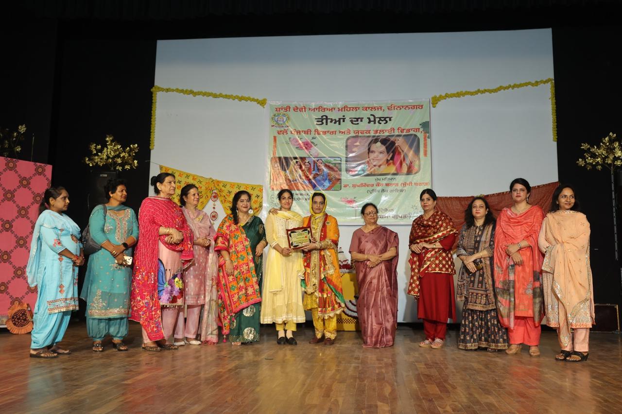 The event was attended and enjoyed by college staff, students, and female city residents. A galaxy of esteemed personalities, including Principal Ms. Nirmal Pandhi, Parveen Baba ji, Ms. Mamta, Principal Jyoti Bala, Ms. Binni Mahajan, Ms. Paramjeet (MC Dinanagar), Ms. Dimple (MC Dinanagar), Ms. Asha (MC Dinanagar), Ms. Misha Gupta, and Ms. Indu Mahajan, graced the event with their presence. On this auspicious occasion, Madam Principal, Ms. Namita Gupta, eminent committee member along with senior staff members honoured the chief guest with traditional Phulkari and memento. Principal Mrs. Nirmal Pandhi, Parveen Baba ji, and other distinguished guests were felicitated with honors. The talented girls who secured the top three positions were awarded prizes in recognition of their excellence. The judges of the event were specially honoured for their keen judgement. Madam kulwinder Kaur appreciated the efforts of the faculty of Punjabi Department, Madam Hardeep who set up the traditional outlook, Ms. Sonia from Cosmetology Department who decked out the students for the performances and other staff members who made this event a grand success. The entire college staff was also present, adding to the grandeur of the occasion. The event culminated in resounding success, leaving an indelible mark on the hearts of all who attended, with cherished memories to treasure forever.