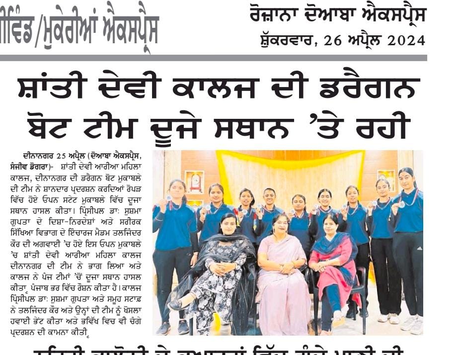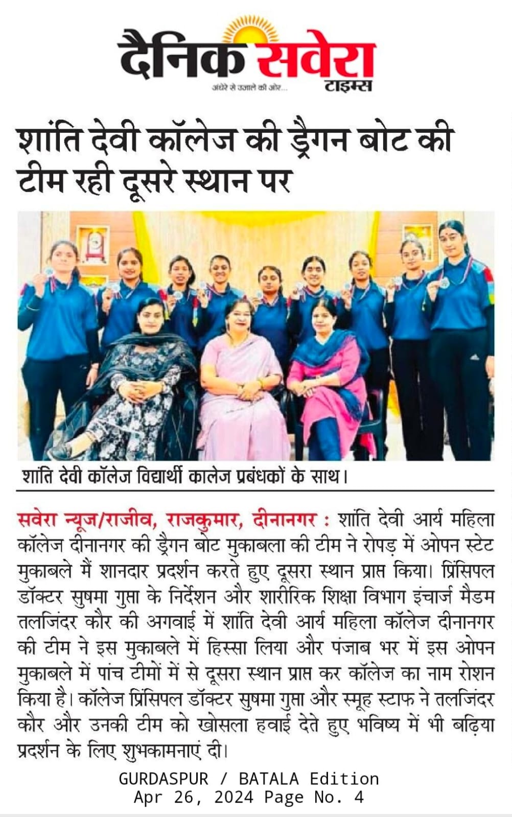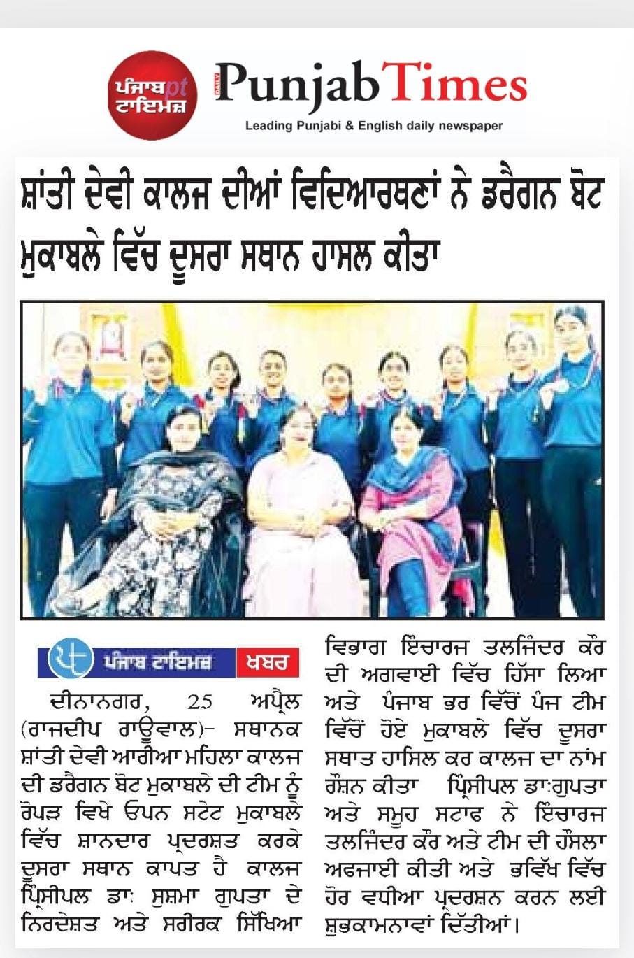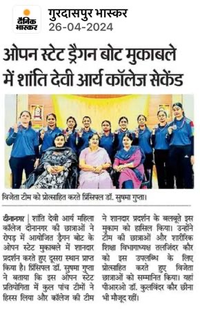 26 Apr 2024 ↑ Under the esteemed leadership of Principal Dr. Sushma Gupta, Mr. Dharam Indu Gupta, Secretary, Managing Committee and the guidance of Physical Education Department Head Prof. Taljinder Kaur, the students of Physical Education Department showcased remarkable prowess at the Open State Level Dragon Boat Competition held in Ropar, Punjab on 29th and 30th March 2024. Out of five competing teams, the college secured a notable 2nd position overall, reflecting the dedication and skill of its participants.Madam principal along with Dr. kulwinder Kaur Chheena congratulated all participants for their hard work and determination in representing the college with distinction at the competition. Their victory was celebrated with pomp and show.