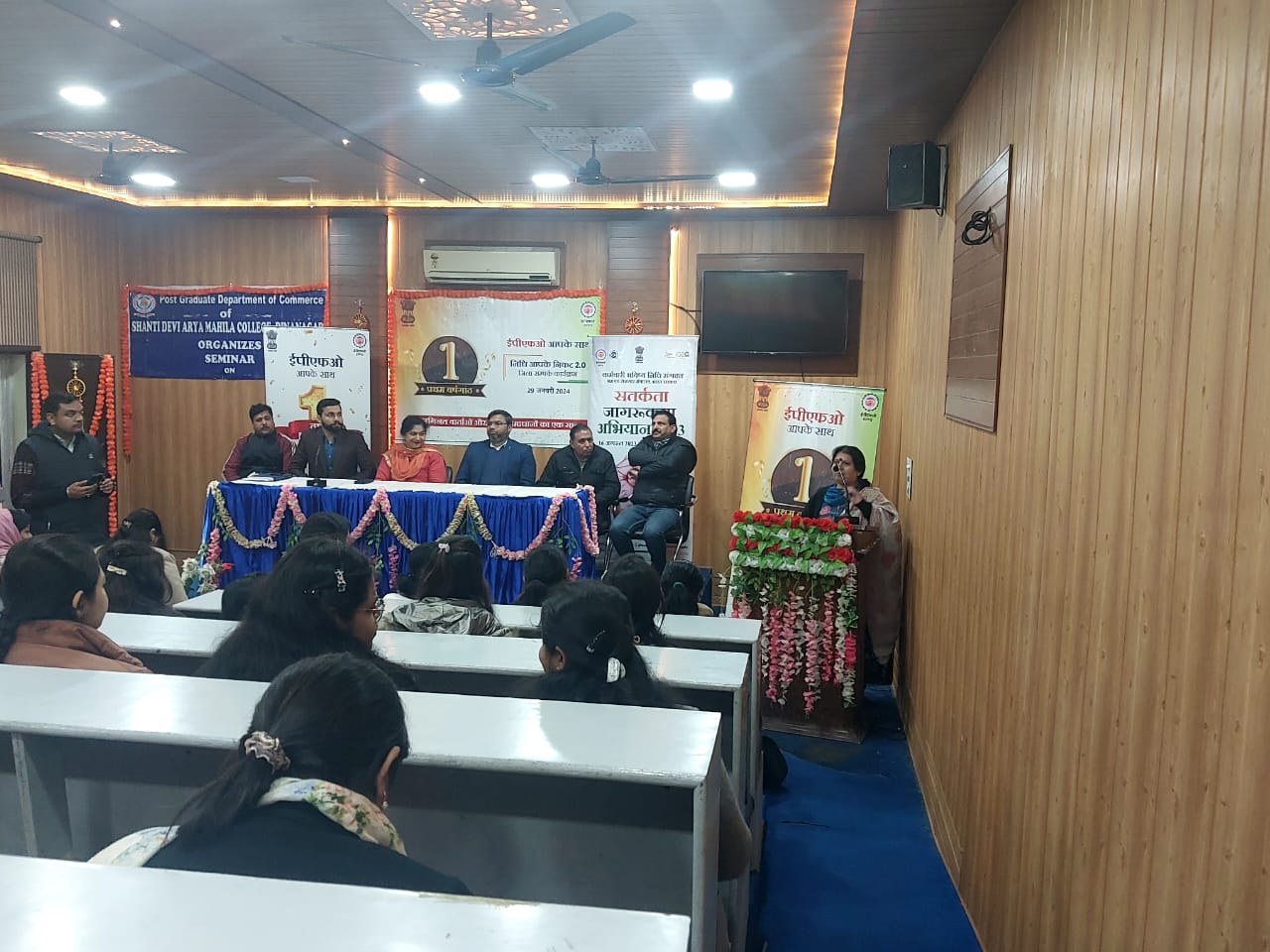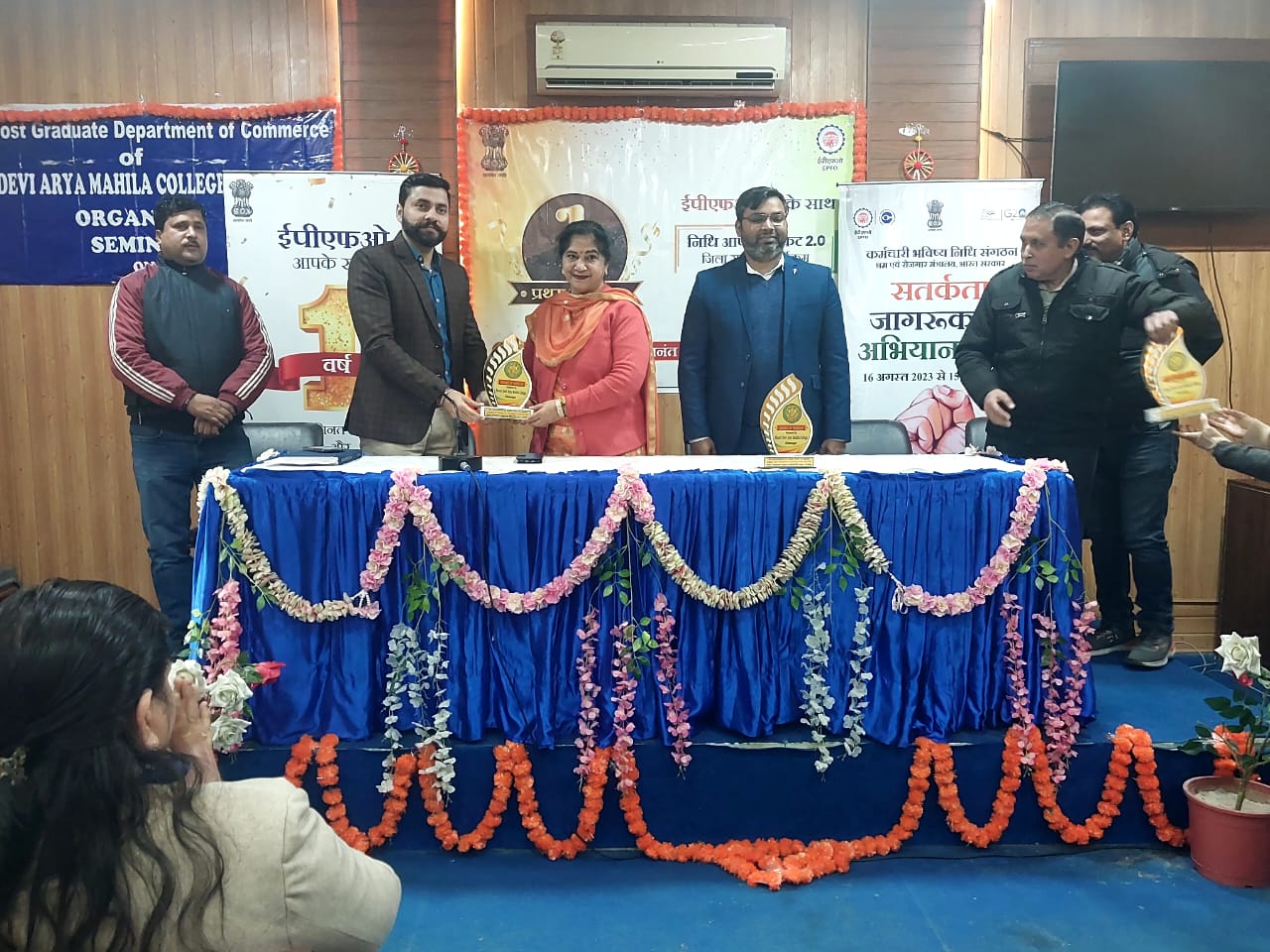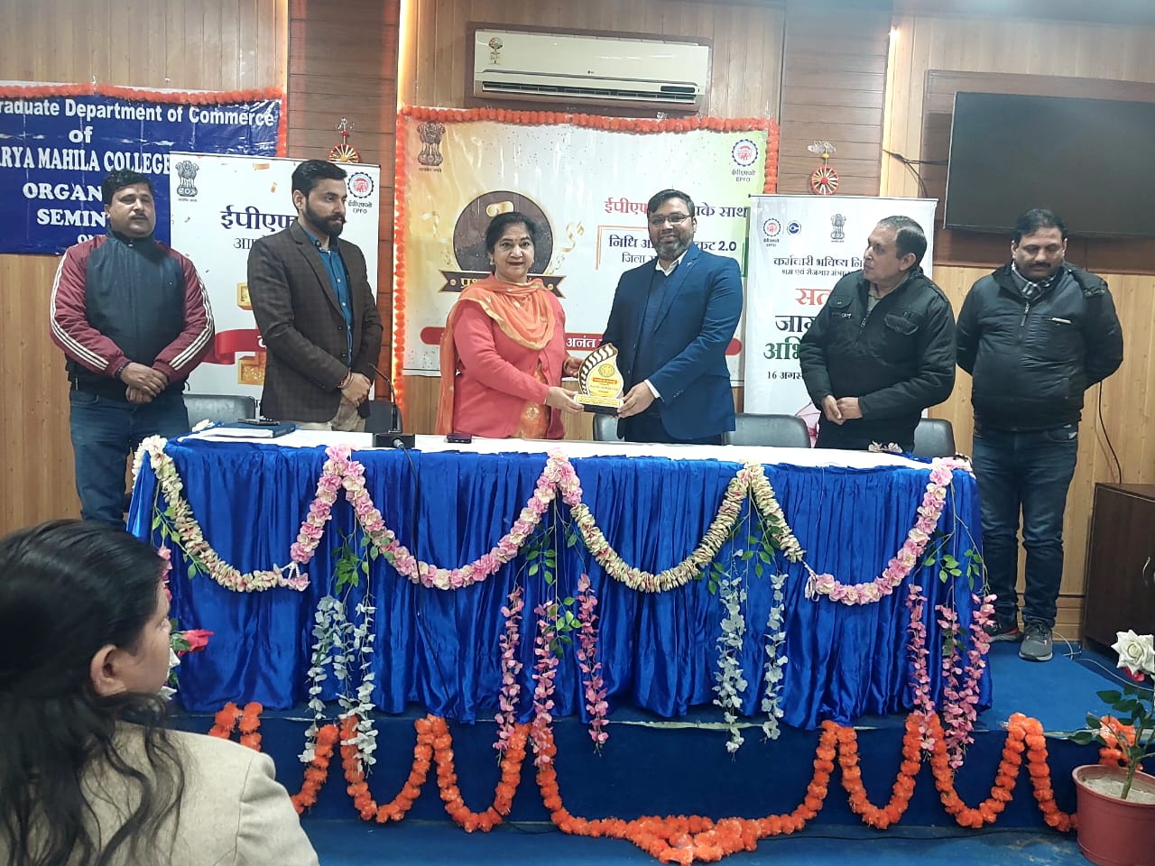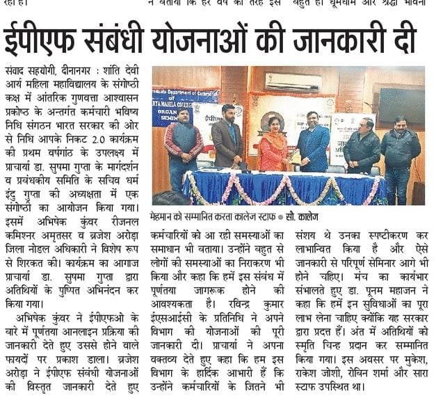 The guests were given floral welcome by Principal Madam. While giving complete information about the online process, Mr. Abhishek Kunwar narrated the merits of E.P.F.O. Mr. Brajesh Arora, while giving detailed information about EPF related schemes, also gave solutions to the problems faced by the employees. Mr. Ravindra Kumar, representative of ESIC, gave complete information about the schemes of his department. While giving her statement, the Principal Madam said that we are deeply grateful to this department that they have benefited the employees by clarifying all their doubts and such seminars full of information should be held in future as well. While taking charge of the forum, Dr. Poonam Mahajan Said that we should take full advantage of these facilities because they are provided by the government. At the end the guests were honored by presenting mementos. At this juncture, Mr. Mukesh, Mr. Rakesh Joshi, Mr. Robin Sharma and other staff members were present.